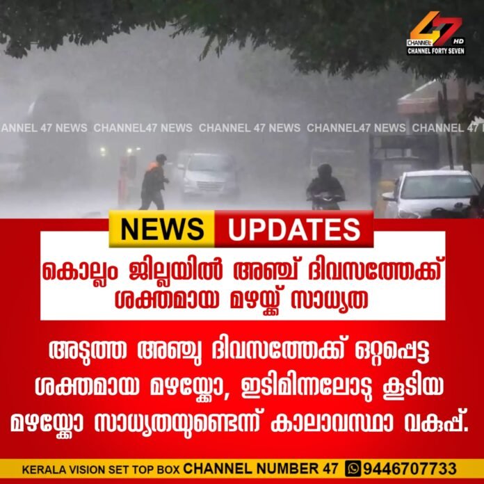അടുത്ത അഞ്ചു ദിവസത്തേക്ക് ഒറ്റപ്പെട്ട ശക്തമായ മഴയ്ക്കോ, ഇടിമിന്നലോടു കൂടിയ മഴയ്ക്കോ സാധ്യതയുണ്ടെന്ന് കാലാവസ്ഥാ വകുപ്പ്. തിരുവനന്തപുരം, കൊല്ലം, ആലപ്പുഴ, പത്തനംതിട്ട, കോട്ടയം, ഇടുക്കി, മലപ്പുറം എന്നീ ഏഴു ജില്ലകളില് ഇന്ന് യെലോ അലര്ട്ട് പ്രഖ്യാപിച്ചിട്ടുണ്ട്.