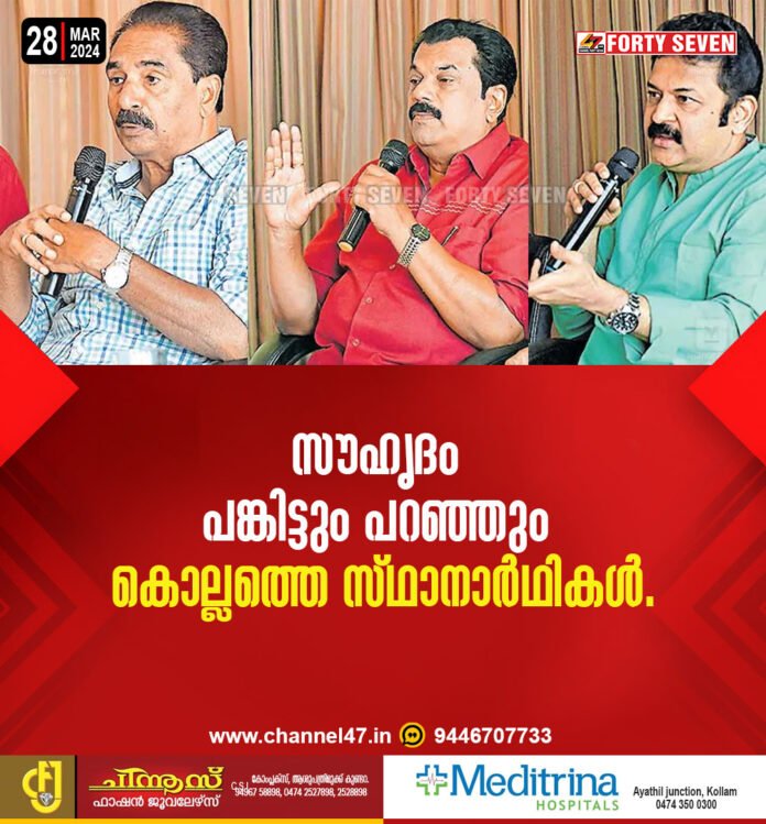 കൊല്ലം | തിരഞ്ഞെടുപ്പു പ്രചാരണ തിരക്കുകളിലേക്ക് മുഴുകുന്നതിനു മുൻപായി രാവിലെ കൊല്ലം ലോക്സഭാ മണ്ഡലത്തിലെ മൂന്നു മുന്നണിയുടെയും സ്ഥാനാർഥികൾ സൗഹൃദ സംഭാഷണത്തിനായി എത്തി, മലയാള മനോരമ സംഘടിപ്പിച്ച പോൾ കഫേയിൽ. യുഡിഎഫിലെ എൻ.കെ.പ്രേമചന്ദ്രനും എൽഡിഎഫിലെ എം.മുകേഷും ബിജെപിയിലെ ജി.കൃഷ്ണകുമാറുമാണ് വേദിയിൽ. നർമത്തിൽ ചാലിച്ച സംഭാഷണത്തിൽ ഒട്ടേറെ ഗൗരവ വിഷയങ്ങളും കടന്നുവന്നു.