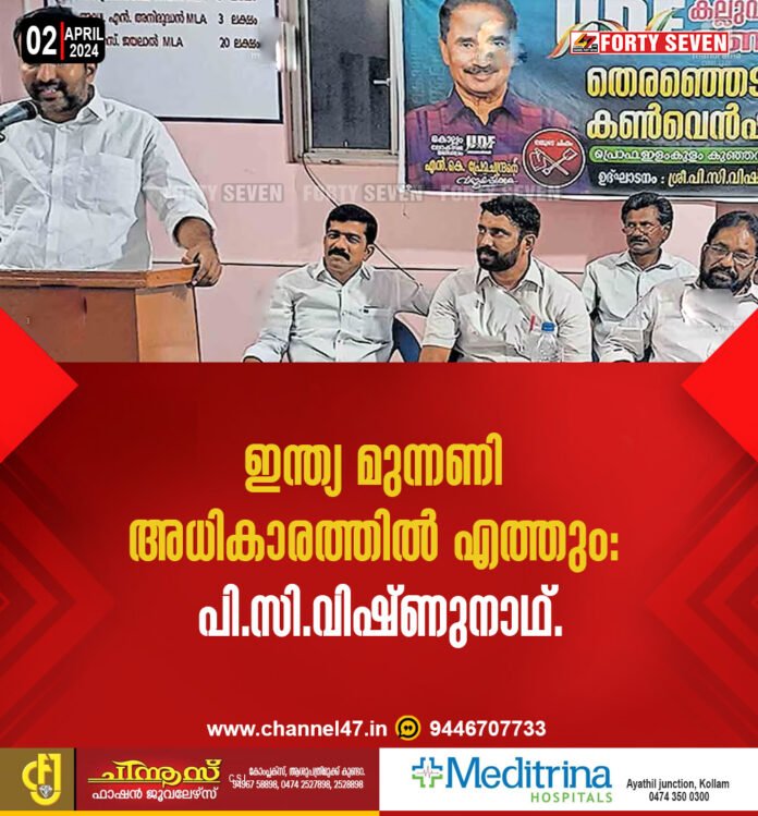 കല്ലുവാതുക്കൽ | കോൺഗ്രസ് നേതൃത്വം നൽകുന്ന ഇന്ത്യ മുന്നണി കേന്ദ്രത്തിൽ അധികാരത്തിലെത്തുമെന്നും കേരളത്തിലെ ഇരുപത് സീറ്റുകളും യുഡിഎഫ് നേടുമെന്നും പി.സി.വിഷ്ണുനാഥ് എംഎൽഎ. കല്ലുവാതുക്കൽ മണ്ഡലം യുഡിഎഫ് തിരഞ്ഞെടുപ്പ് കൺവൻഷൻ ഉദ്ഘാടനം ചെയ്യുകയായിരുന്നു. യുഡിഎഫ് ചെയർമാൻ വട്ടക്കുഴിക്കൽ മുരളി അധ്യക്ഷത വഹിച്ചു.ആർഎസ്പി സംസ്ഥാന കമ്മിറ്റി അംഗം ബിന്നി നാവായിക്കുളം മുഖ്യപ്രഭാഷണം നടത്തി.
