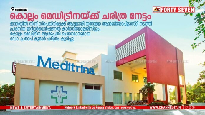 കൊല്ലം മെഡിട്രീന ആശുപത്രി ചെയർമാനുമായ ഡോ പ്രതാപ് കുമാർ ചരിത്രം കുറിച്ചു. സ്പെയിൻ CTO ക്ലബ്ബ് നേതൃത്വം നൽകിയ ഇൻറ്റർവെൻഷണൽ കാർഡിയോളജിസ്റ്റുകളുടെ ദേശീയ കോൺഫറൻസിലാണ് അഭിമാനകരമായ ഈ നേട്ടം കൈവരിച്ചത്. ഹൃദയ ധമനികളിലെ നൂറു ശതമാനം ബ്ലോക്കുകൾ ഉള്ള കേസുകൾ രാജ്യാന്തര തലത്തിൽ അവതരിപ്പിച്ചതിൽ ഇന്ത്യയെ പ്രതിനിധീകരിച്ചത് കൊല്ലം സ്വദേശിയായ ഡോ പ്രതാപ് കുമാറാണ്. വിജയകരമായ പ്രെസൻറ്റേഷനു ശേഷം സ്പെയിൻ CTO ക്ലബ്ബ് അംഗങ്ങൾ ഡോ പ്രതാപ് കുമാറുമായി ഓൺലൈൻ സംവാദം നടത്തി അഭിനന്ദനം അറിയിച്ചു. ഹൃദ്രോഗ ചികിത്സാരംഗത്ത് രാജ്യത്ത് ഒന്നാമത് നിൽക്കുന്ന സ്വകാര്യ ആശുപത്രി ഗ്രൂപ്പാണ് മെഡിട്രീന. 100 % ബ്ലോക്കുകളുള്ള ഹൃദയശാസ്ത്രക്രീയകൾ വരെ വിജയകരമായി ചികിൽസിക്കുന്ന ലോകോത്തര നിലവാരത്തിലുള്ള ഹൃദ്രോഗ ചികിത്സ കേന്ദ്രമാണ് മെഡിട്രീന ഹോസ്പിറ്റൽ ഗ്രൂപ്പ്.