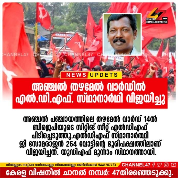 അഞ്ചല് തഴമേല് വാര്ഡില് എല്ഡിഎഫ്; ജി സോമരാജന് വിജയം