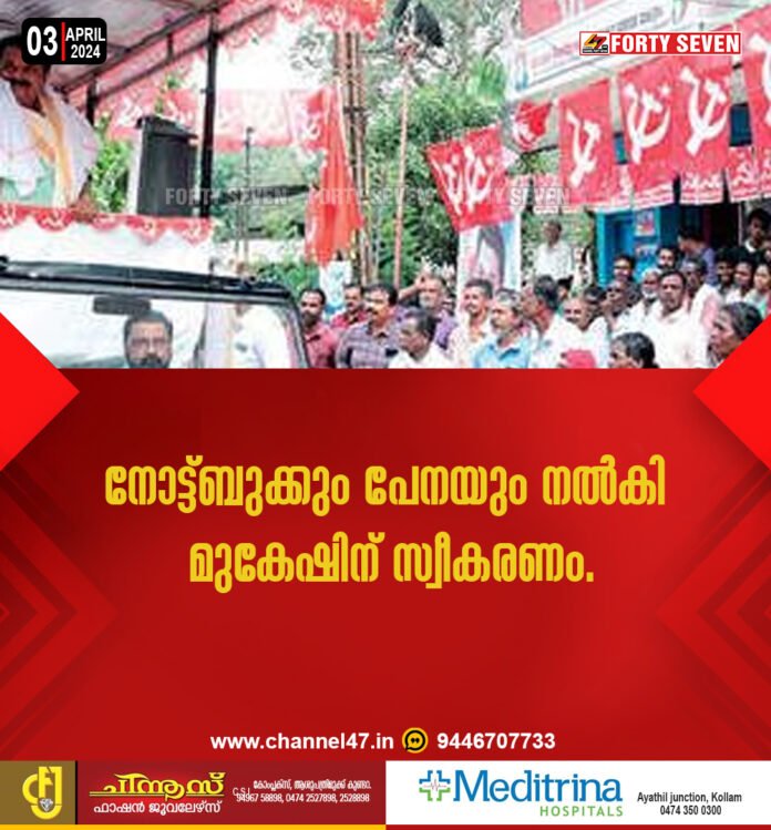 ചാത്തന്നൂർ | കൊല്ലം പാർലമെന്റ് മണ്ഡലം എൽ.ഡി.എഫ്. സ്ഥാനാർഥി എം.മുകേഷിന് വിവിധയിടങ്ങളിൽ നോട്ട്ബുക്കുകളും പേനയും നൽകി സ്വീകരണം. ചാത്തന്നൂർ മണ്ഡലത്തിലെ കല്ലുവാതുക്കൽ, പാരിപ്പള്ളി, പൂതക്കുളം, നെടുങ്ങോലം, മേവനക്കോണം മേഖലകളിലായിരുന്നു പര്യടനം. സ്ഥാനാർഥിയുടെ അഭ്യർഥന മാനിച്ചാണ് നോട്ട്ബുക്കുകളും പേനയും നൽകിയത്.