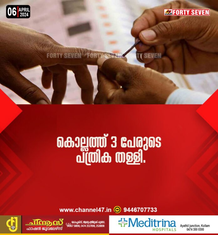 കൊല്ലം | ലോക്സഭ തിരഞ്ഞെടുപ്പിന് കൊല്ലത്ത് 12 സ്ഥാനാർഥികളുടെ നാമനിർദേശ പത്രിക അംഗീകരിച്ചു. 3 പത്രികകൾ തള്ളി. കരീപ്ര കടയ്ക്കോട് മനു സ്മൃതിയിൽ എം.എസ്.മനുശങ്കർ, ഡമ്മി സ്ഥാനാർഥികൾ ആയിരുന്ന എസ്.ആർ.അരുൺ ബാബു (സിപിഎം), ശശികല റാവു (ബിജെപി) എന്നിവരുടെ പത്രികകളാണ് നിരസിച്ചത്. മതിയായ രേഖകൾ സമർപ്പിക്കാതിരുന്നതാണ് മനുശങ്കറിന് അയോഗ്യതയായത്. പാർട്ടി സ്ഥാനാർഥികളുടെ പത്രിക അംഗീകരിച്ചതോടെ സ്വാഭാവിക നടപടി ക്രമ പ്രകാരമാണ് അരുൺ ബാബുവും ശശികല റാവുവും പുറത്തായത്. എട്ടിന് വൈകിട്ട് 3 വരെ വരെ പത്രിക പിൻവലിക്കാം.