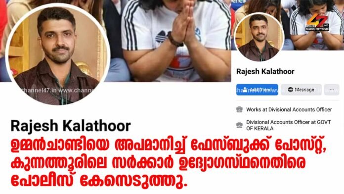 ഉമ്മൻ ചാണ്ടിയെ അപമാനിച്ച് ഫേസ്ബുക്ക് പോസ്റ്റ്, കുന്നത്തൂരിലെ സർക്കാർ ഉദ്യോഗസ്ഥനെതിരെ പോലീസ് കേസെടുത്തു