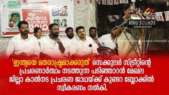കുണ്ടറ | “ഇന്ത്യയെ മതരാഷ്ട്രമാക്കരുത് ” എന്ന മുദ്രാവാക്യമുയർത്തി ഡിവൈഎഫ്ഐ ബ്ലോക്ക് കേന്ദ്രങ്ങളിൽ ആഗസ്റ്റ് 15ന് സംഘടിപ്പിക്കുന്ന സെക്കുലർ സ്ട്രീറ്റിന്റെ പ്രചരണാർത്ഥം നടത്തുന്ന പടിഞ്ഞാറൻ മേഖല ജില്ലാ കാൽനട പ്രചരണ ജാഥയ്ക്ക് കുണ്ടറ ബ്ലോക്കിലെ വിവിധ കേന്ദ്രങ്ങളിൽ സ്വീകരണം നൽകി. ഡിവൈഎഫ്ഐ ജില്ലാ സെക്രട്ടറി ശ്യാം മോഹൻ ക്യാപ്റ്റനും സംസ്ഥാന കമ്മിറ്റിയംഗം എസ് ആർ രാഹുൽ മാനേജരും ജില്ലാ ജോയിന്റ് സെക്രട്ടറി എം ഹരികൃഷ്ണൻ, ജില്ലാ സെക്രട്ടറിയേറ്റംഗം യു പവിത്ര എന്നിവർ വൈസ് ക്യാപ്റ്റൻമാരുമായ ജാഥയിൽ നൂറുകണക്കിന് യുവജനങ്ങൾ പങ്കാളിയായി. നാലാം ദിവസത്തെ ജാഥയുടെ ഉദ്ഘാടനം ചിറ്റുമലയിൽ സിഐടിയു സംസ്ഥാന വൈസ് പ്രസിഡന്റ് അഡ്വ. പി സജി നിർവഹിച്ചു.സിപിഐ(എം) ഏരിയ സെക്രട്ടറി എസ് എൽ സജികുമാർ പങ്കെടുത്തു. മുളവന, പെരുമ്പുഴ, കേരളപുരം എന്നിവിടങ്ങളിലെ സ്വീകരണത്തിന് ശേഷം ചെറുമൂട് സമാപിച്ചു. സമാപന സമ്മേളനം സിഐടിയു അഖിലേന്ത്യാ വൈസ് പ്രസിഡന്റ് ജെ മേഴ്സികുട്ടിയമ്മ ഉദ്ഘാടനം ചെയ്തു.വിവിധ കേന്ദ്രങ്ങളിൽ ഡിവൈഎഫ്ഐ നേതാക്കളായ ആർ അനിൽ, ടി പി അഭിമന്യു,അൻസർ, അരുൺ,ശ്യാം ശരത് ബി ചന്ദ്രൻ , വിനു,മനുദാസ്,മുഹമ്മദ് റാഫി എന്നിവർ സംസാരിച്ചു. ജാഥ ആഗസ്റ്റ് 5 ന് കൊട്ടിയം ബ്ലോക്കിൽ പര്യടനം നടത്തും.