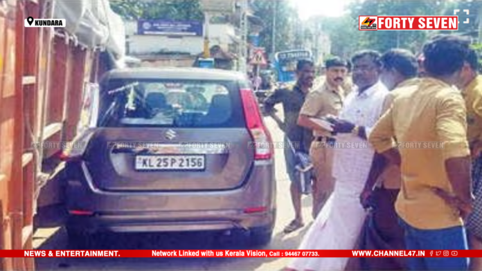 ഡ്രൈവർ അശ്രദ്ധമായി വാഹനം തിരിച്ചതാണ് അപകടത്തിനിടയാക്കിയത്. കുളത്തൂപ്പുഴ പോലീസ് സ്റ്റേഷനിൽനിന്നു വിരമിച്ച എസ്.ഐ. ചോഴിയക്കോട് സ്വദേശി സുബൈർ അബ്ദുൽ ഖരീമിന്റെ കാറാണ് ഭാഗികമായി തകർന്നത്. സംഭവസമയം കാറിൽ ആരുമുണ്ടായിരുന്നില്ല. കുളത്തൂപ്പുഴ പോലീസ് സ്ഥലത്തെത്തി മേൽനടപടകൾ സ്വീകരിച്ചു.