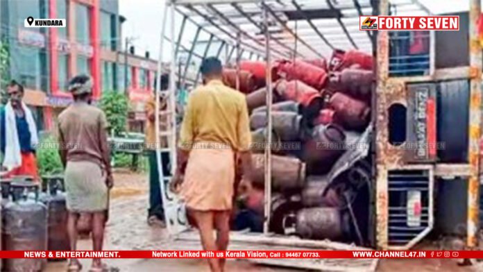 Ⓒചാത്തന്നൂരിൽ മറിഞ്ഞ ട്രക്കിൽനിന്നു ഗ്യാസ് സിലിൻഡറുകൾ മാറ്റുന്നു